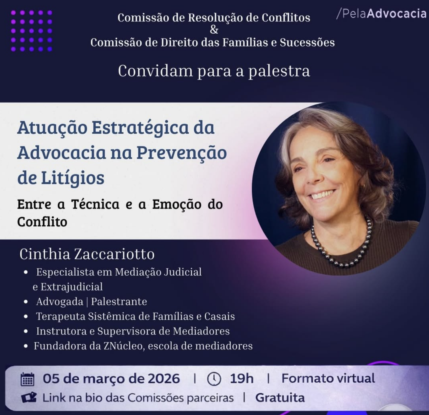 A Comissão de Resolução de Conflitos, em parceria com a Comissão de Direito das Famílias e Sucessões da OAB Sorocaba, convida você para uma palestra imperdível com Cinthia Zaccariotto.