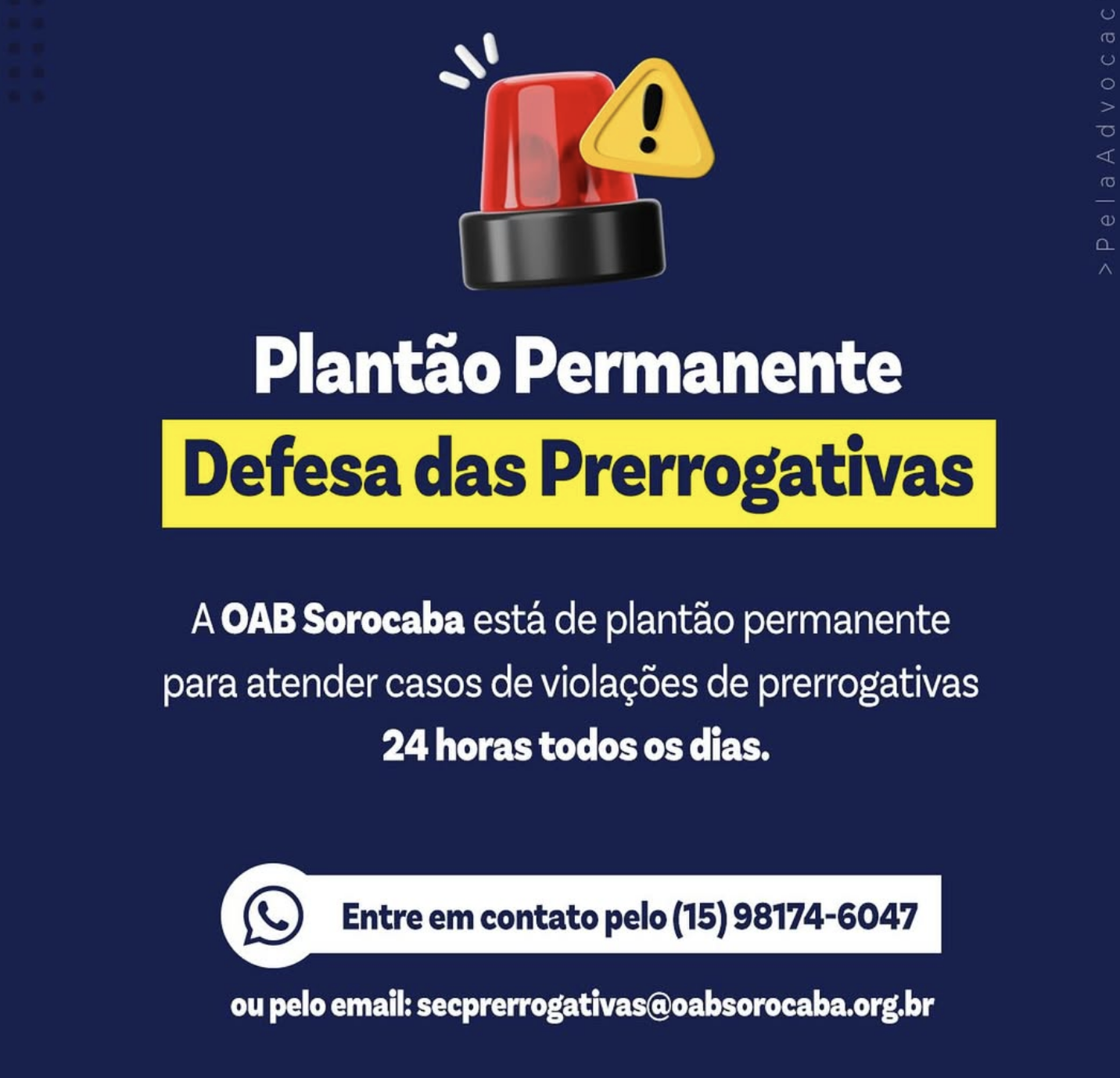 A advocacia não para — e a defesa das prerrogativas também não. Sorocaba está de plantão permanente para atender casos de violações de prerrogativas, 24 horas por dia, todos os dias.